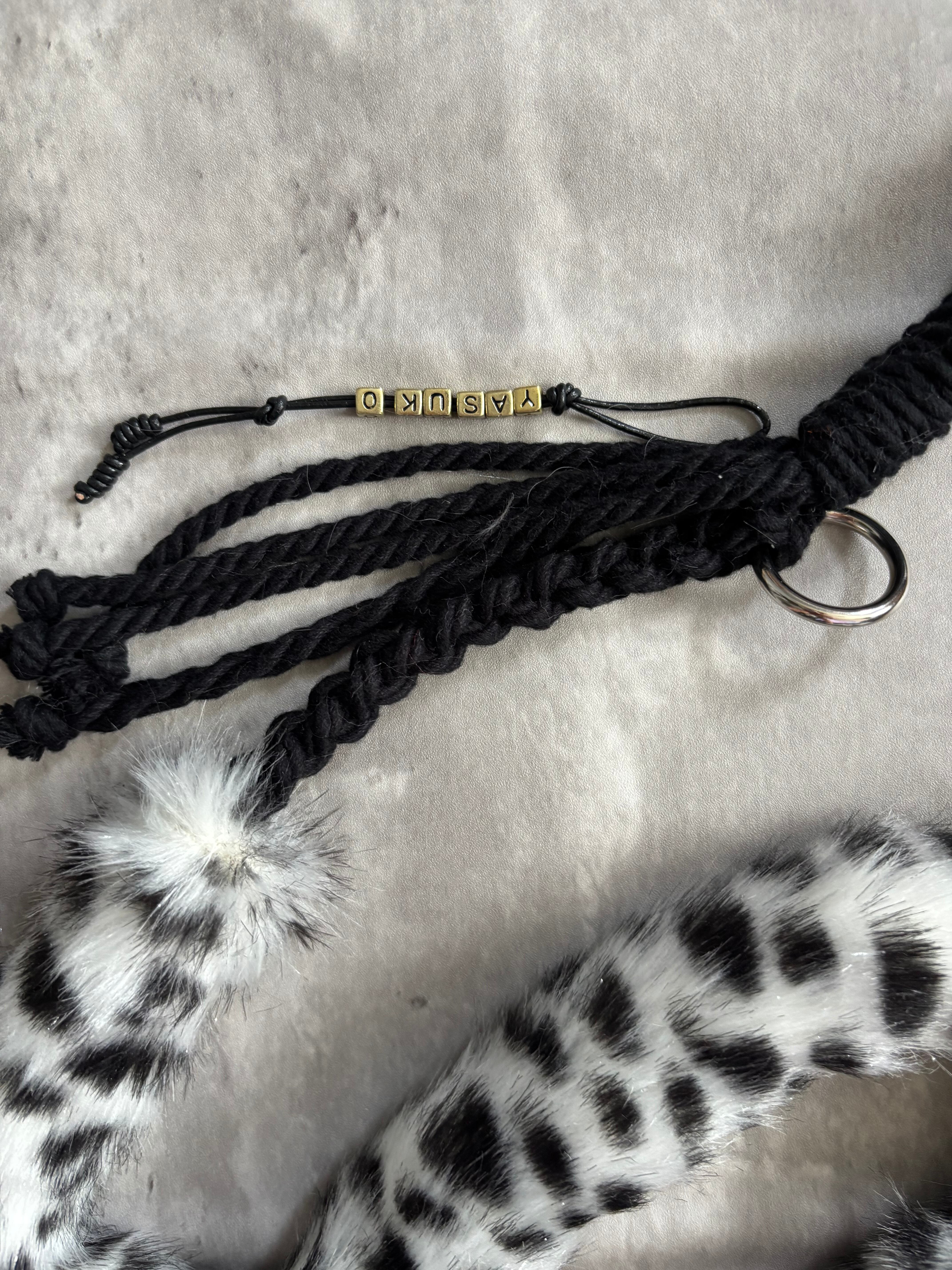 お名前入りビーズに関しては、マクラメコットンリードと同じ色の細い皮を使ったものを使用させていただきます。こちらは税込み980円になります。(10文字まで)